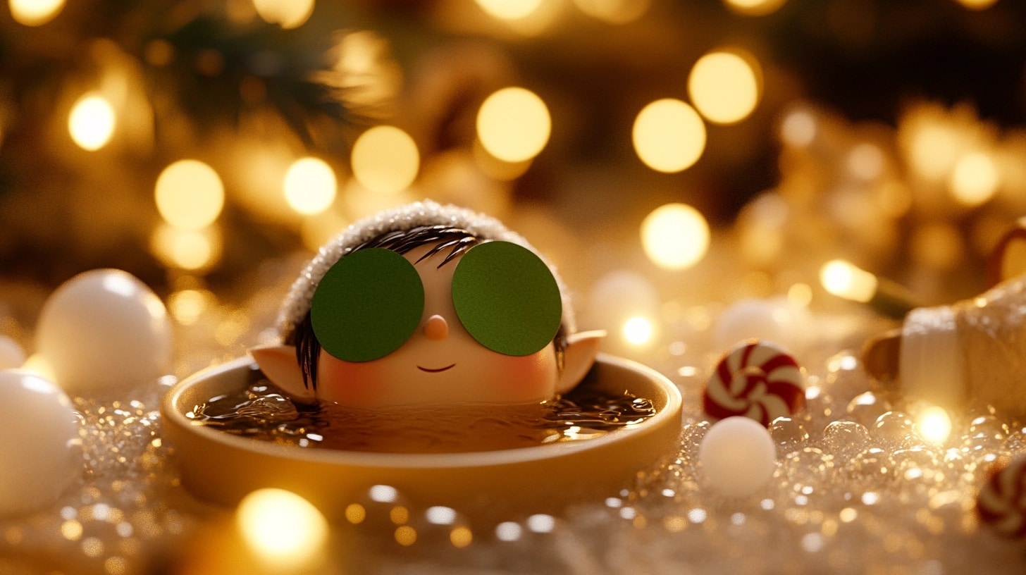 Tiny cucumber slices from green paper rest on the elf’s eyes for a full spa effect.