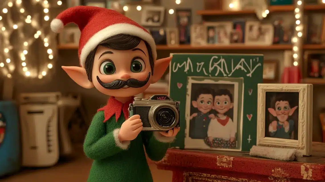 - Create a photography studio setup using toy cameras and small paper signs showing the elf’s artistic vision for their mustache masterpieces.