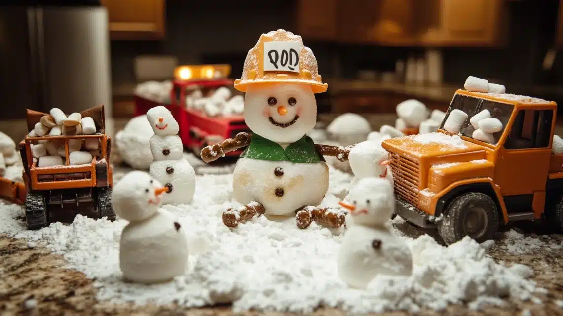 - To create a construction site atmosphere, use toy trucks filled with marshmallow cargo and small warning signs about snowman building in progress.
