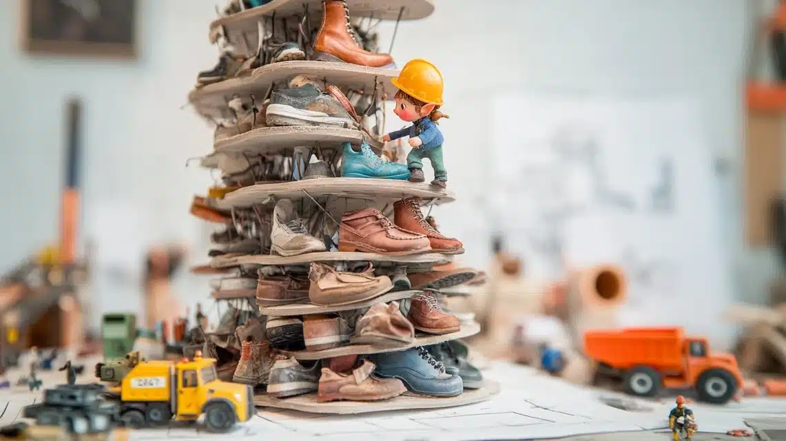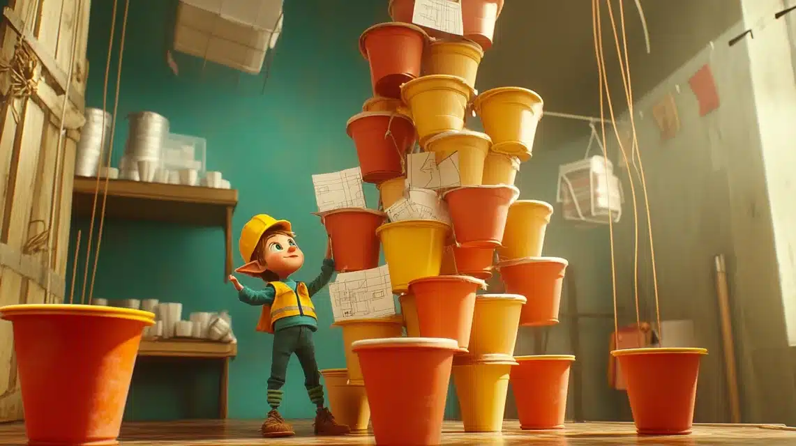 Other toys gather at the bottom with miniature binoculars, watching the climbing expedition.