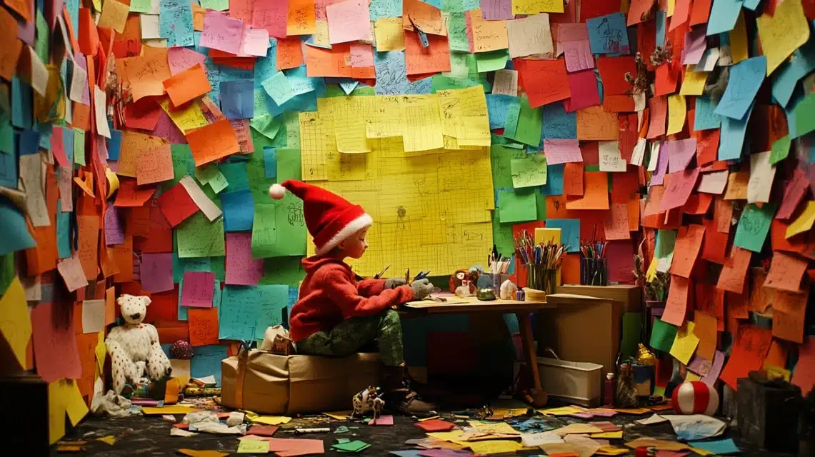 Small sticky notes show meeting agenda items like “Cookie Consumption Reports” and “North Pole Updates.”