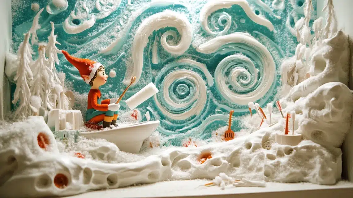 The elf sits proudly on the sink edge, clutching an empty toothpaste tube like a paintbrush.