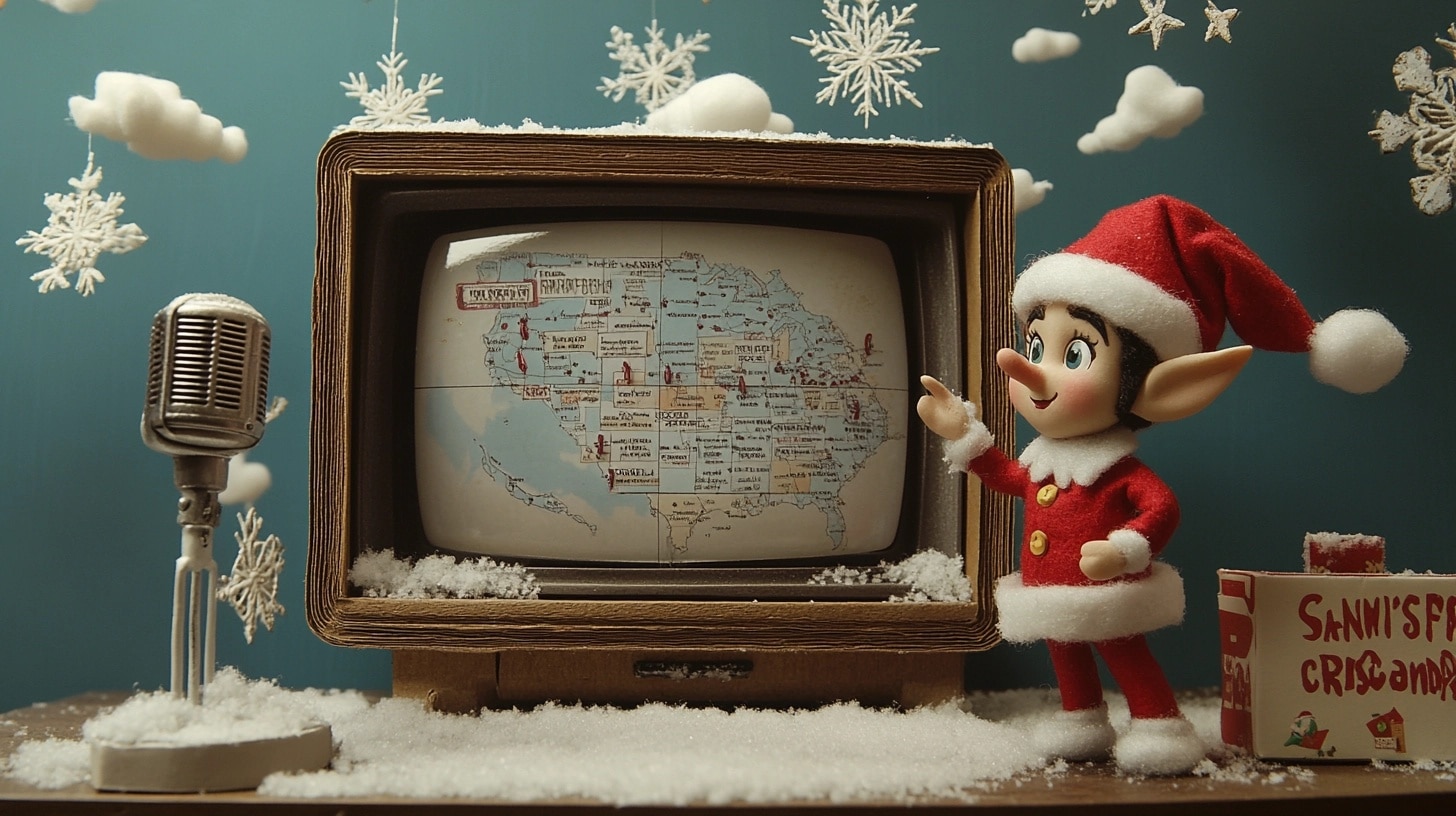 I discovered our elf presenting a full weather report before a hand-drawn map.