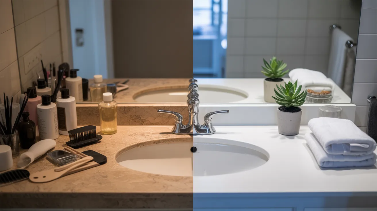 What Changed: Bottles, brushes, and extras were removed from the sink and shower. Towels were folded and arranged neatly. A small plant or candle was added for a clean, fresh look. All surfaces were polished.