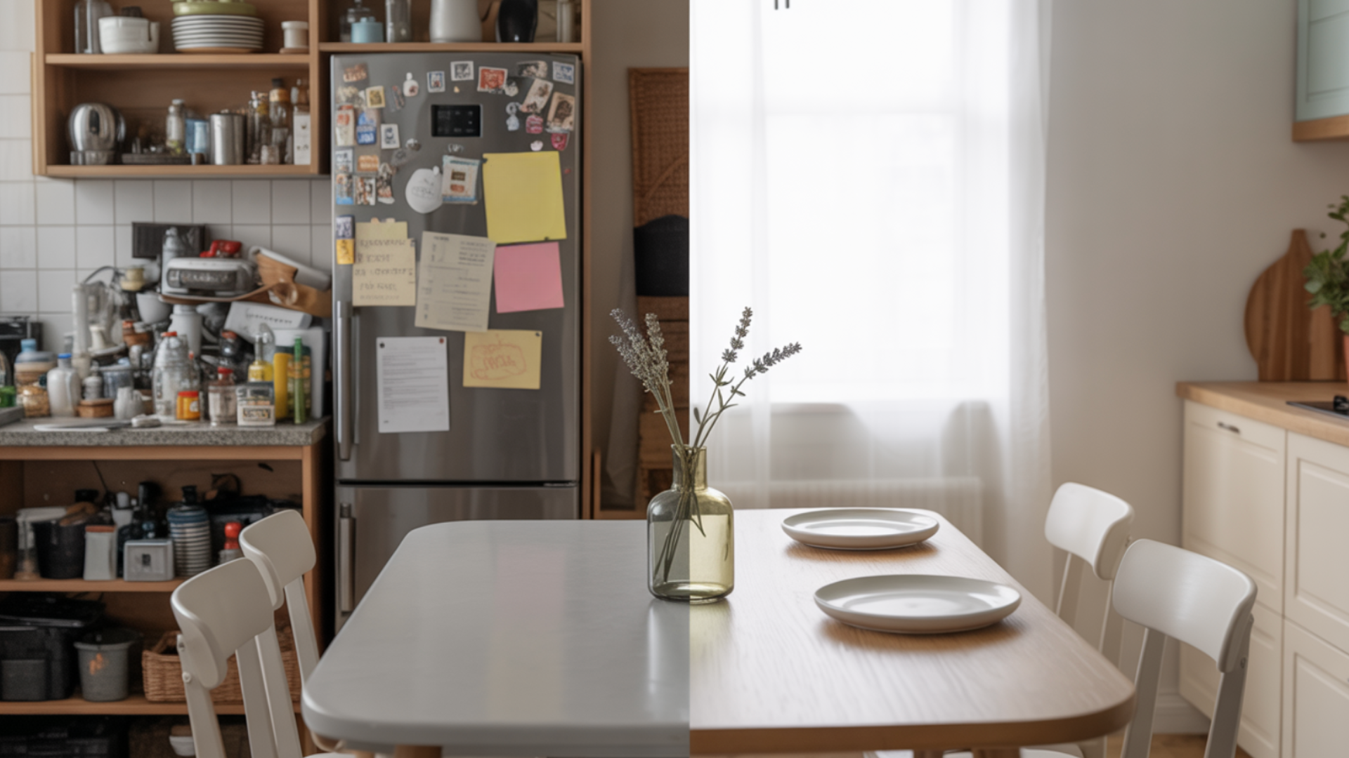 What Changed: Clutter was cleared from the counters, small appliances were stored, and the fridge surface was left clean. A simple table setup with plates and a centerpiece was added to keep the space fresh, tidy, and easy to use.