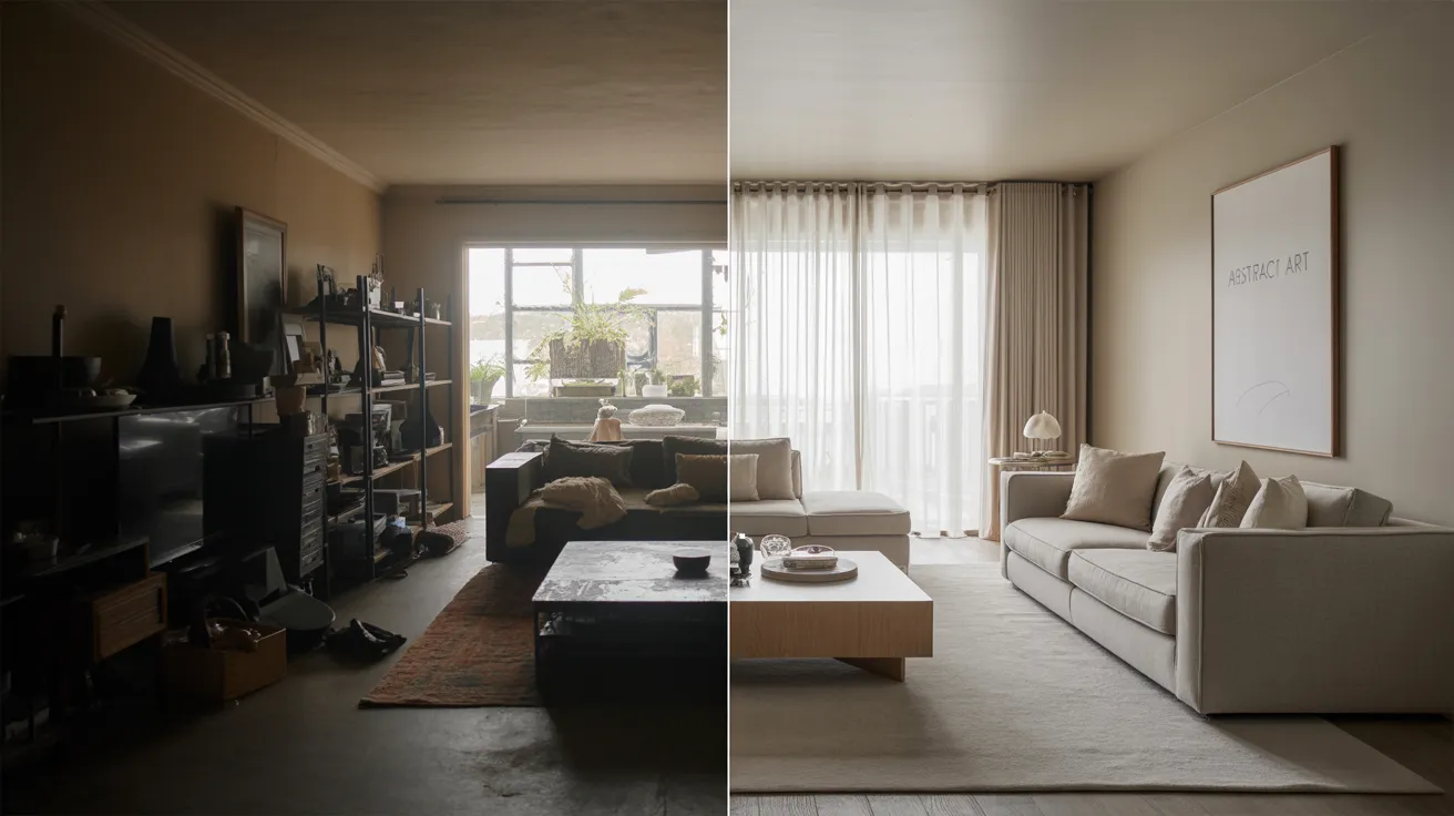 What Changed: Bulky furniture was removed, and personal items were cleared. Soft lighting and light-colored cushions were added, and furniture was rearranged to open up space. The result is a room that looks bigger, cleaner, and more welcoming to buyers