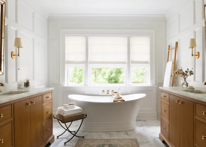 To make your bathroom functional, a bathtub is a great way to bring French country-style vibes to your bathroom. Incorporate a soft-edge white bathtub for the French country-style vibes.