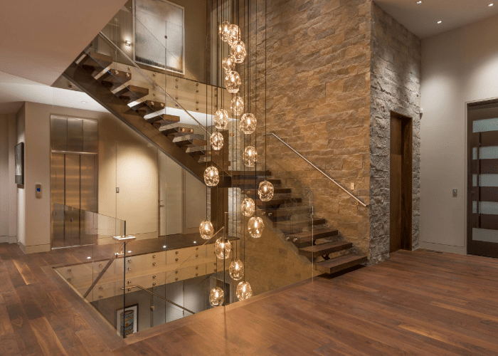 A beautiful chandelier is a classic way to light up a staircase while adding eye-catching style. Opt for a dramatic fixture that makes a bold design declaration. Choose a chandelier that aligns with your decor – modern and sleek, farmhouse or vintage, sparkling and glamorous.