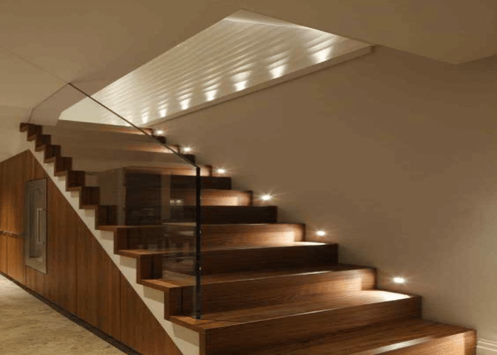 Under-stair lighting recessed into the edge of the steps themselves provides functional and decorative illumination. These tread lights are subtle yet make navigating stairs safer. They also create a striking, almost floating effect.