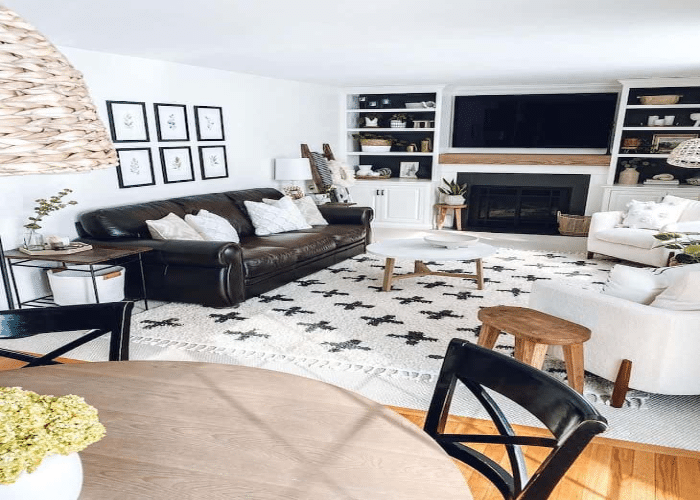 Choose black color frames for the photo frames, as they complement the white color background. The fireplace is fully iron ore color, and it becomes the focal point. Place brown leather sofa, which, against the wall with a coffee table in white color. The white rug with black prints on the floor will complete the look.