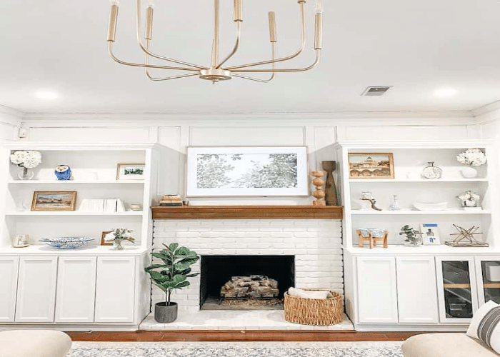Transforming the living room by painting the wall, built-in shelves, and fireplace with Sherwin Williams Alabaster is astounding. The fireplace frame with wood and the TV perfectly blend with the color.