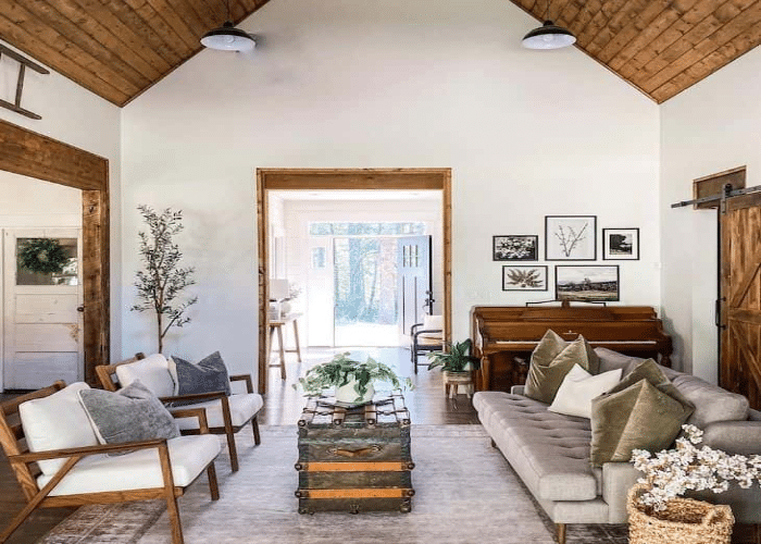 Sherwin Williams Alabaster and wooden ceilings go hand in hand with vintage vibes. They make the living room stand out. As they are the entry point of the house, it must be pleasing and welcoming.