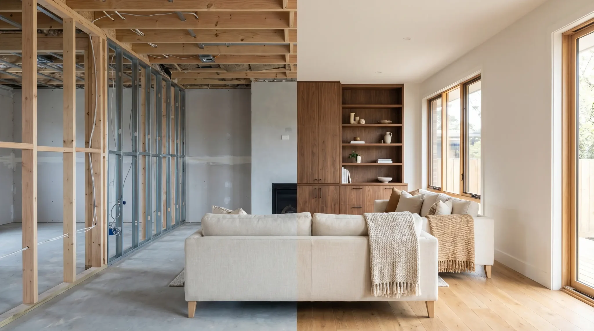 Split image showing room construction transition from unfinished to completed living area with sofa and wooden shelves