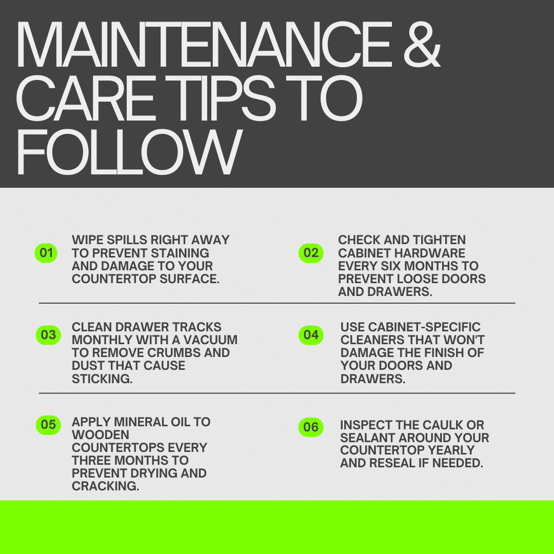 - Get help when lifting heavy items like countertops or large cabinet pieces.