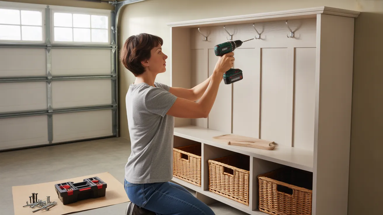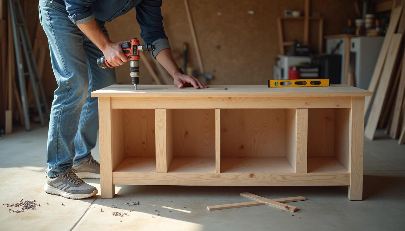 Attach with screws and wood glue. Add a center support underneath if needed. You can build in shoe cubbies now, or leave space for baskets. Keep it level so it doesn’t wobble later.