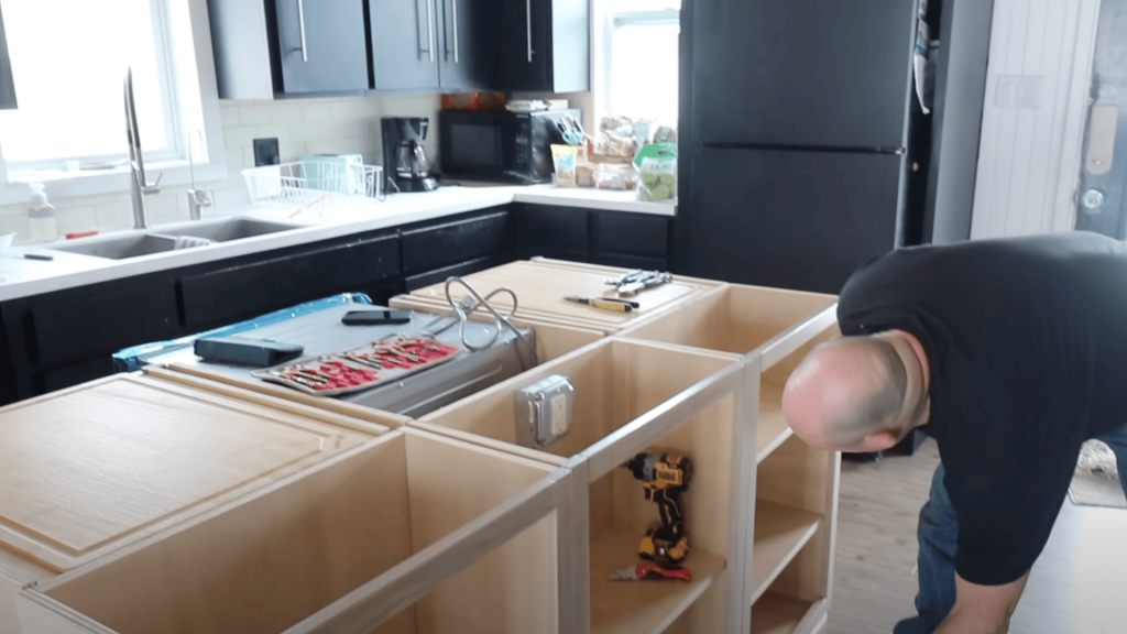 Attach ¾-inch-thick panels around the sides of the island, securing them with screws from the back side. Install cabinets with pocket screws and blocking between boxes.