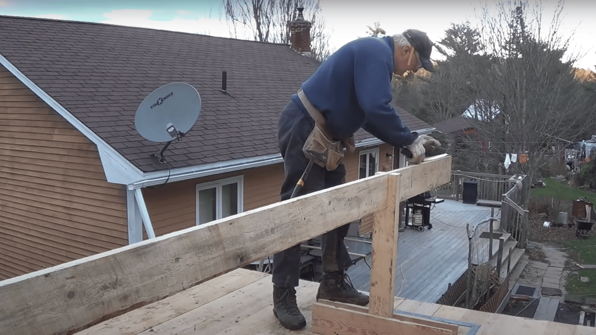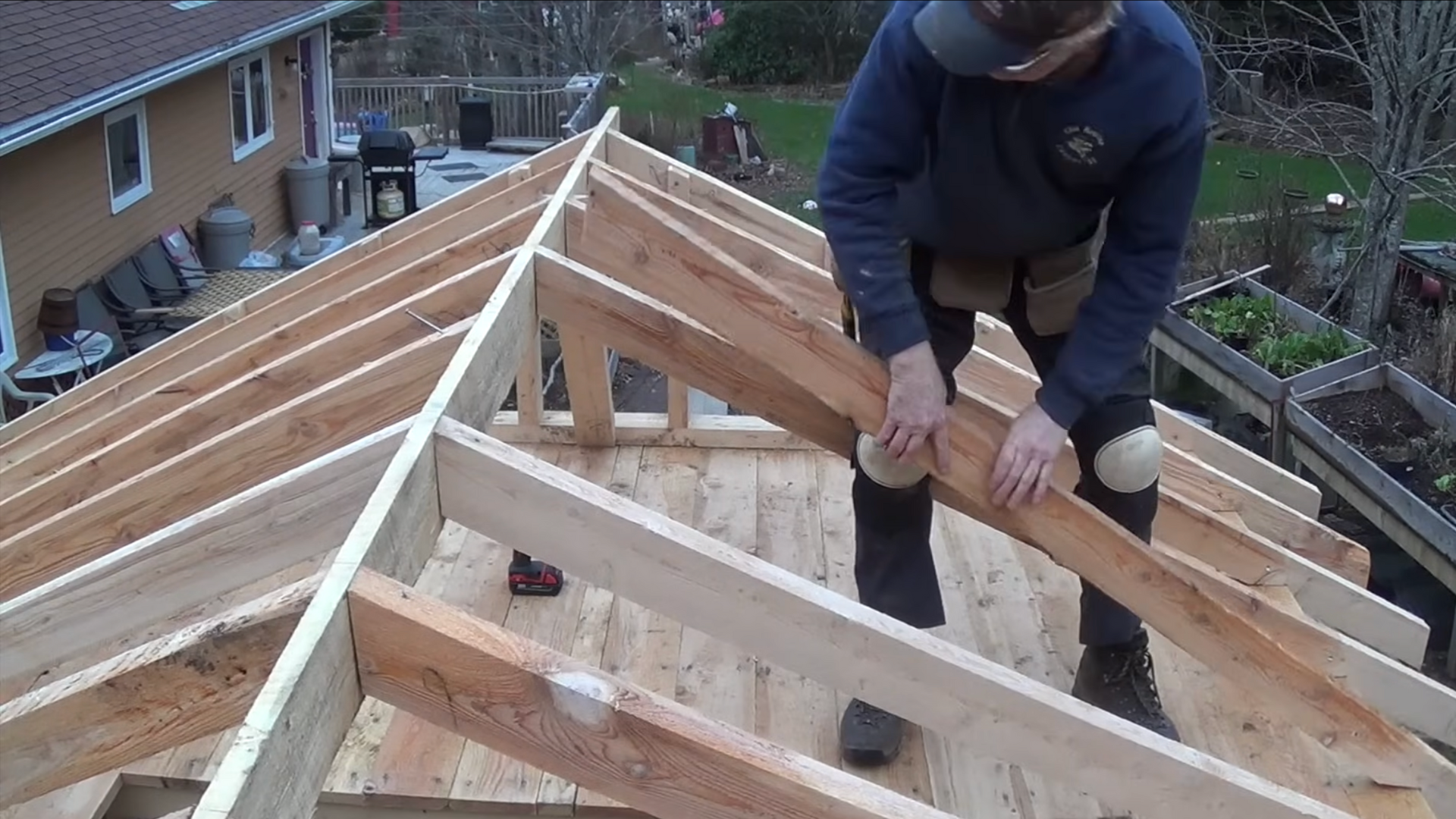 Start by lifting your ridge board to the correct height and securing each end to temporary supports. This piece runs along the roof peak and anchors the top of every rafter.