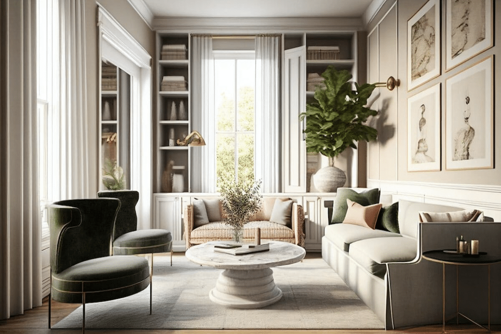 The simplicity and minimalism of furniture with clean lines prevent the rooms from overwhelming intricate details. Furniture with clean lines, curves, and nature-inspired patterns allows light to flow freely and maximizes the perception of space. The lack of ornamentation reduces visual clutter and creates a visually comfortable living room.