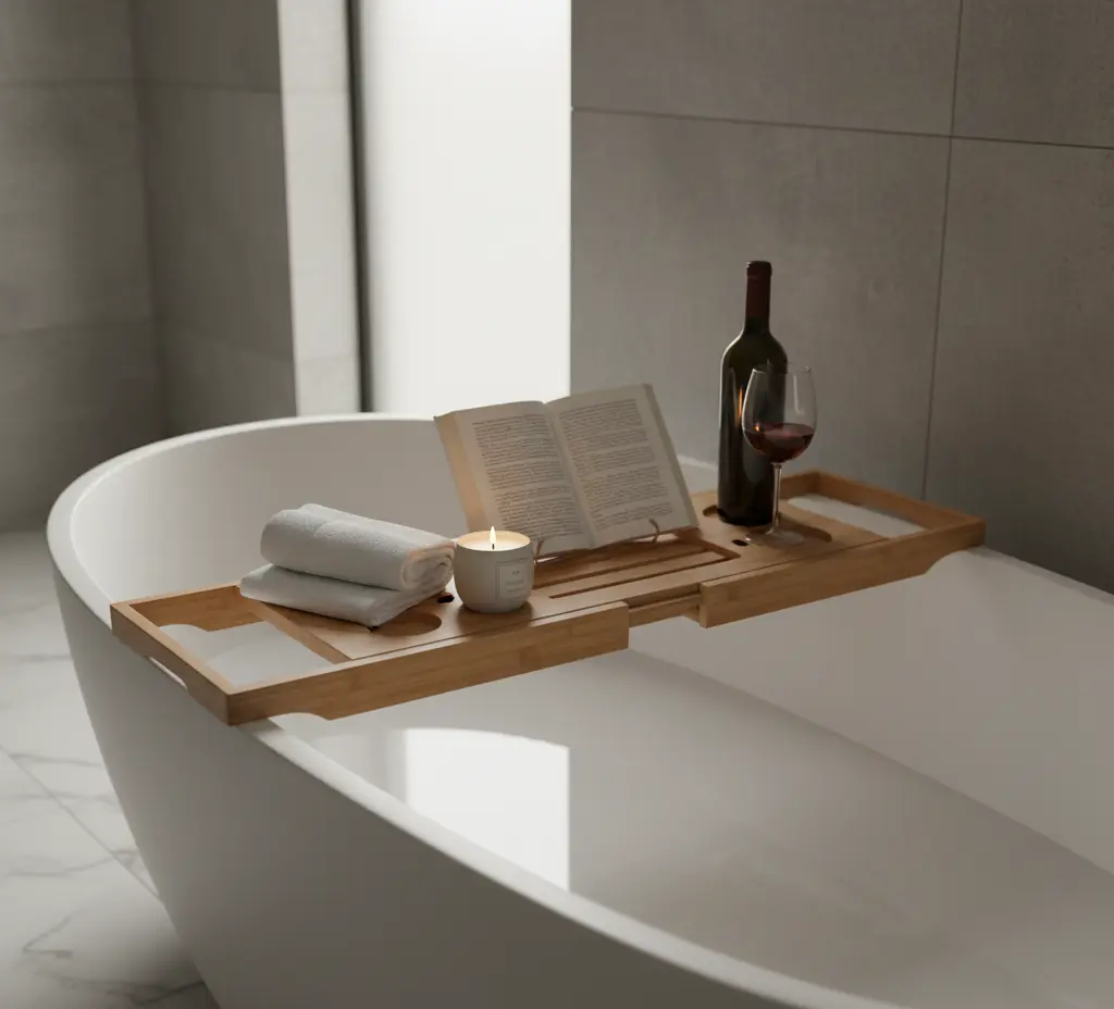 Even a simple wooden bath tray can upgrade your daily ritual – a place to rest a candle, essential oil, or your favorite book – blending beauty and comfort in the most natural way possible.