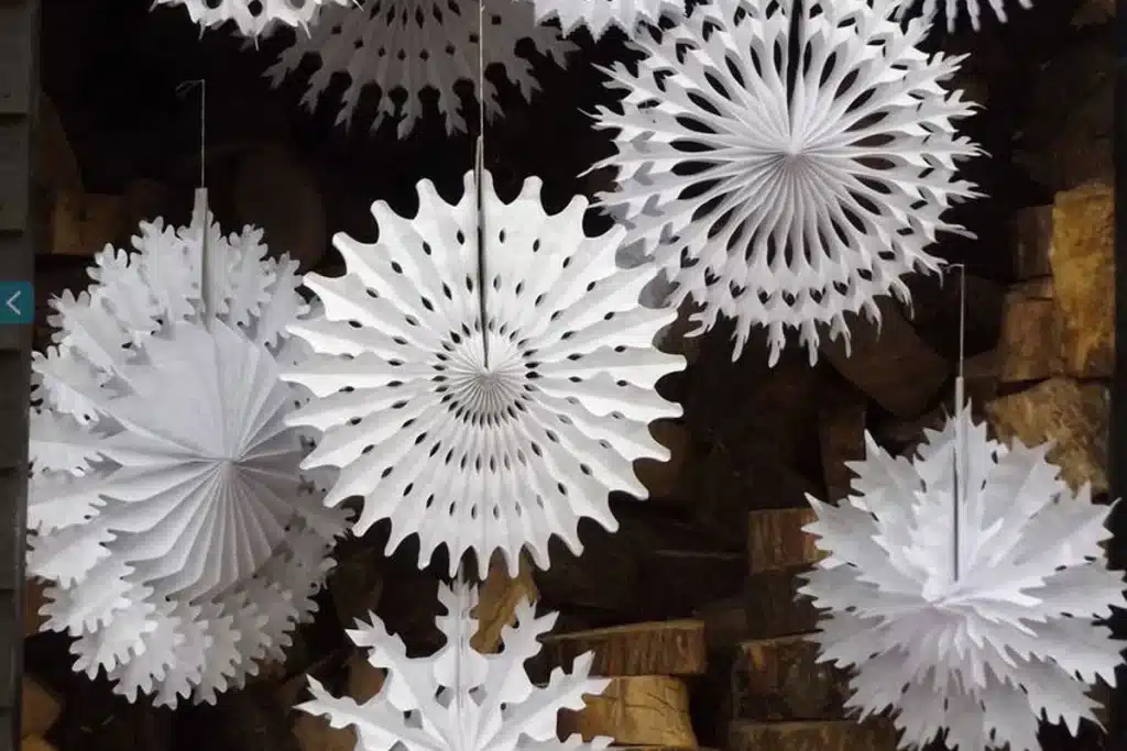 White Christmas banners and white paper snowflakes can be hung on the walls.