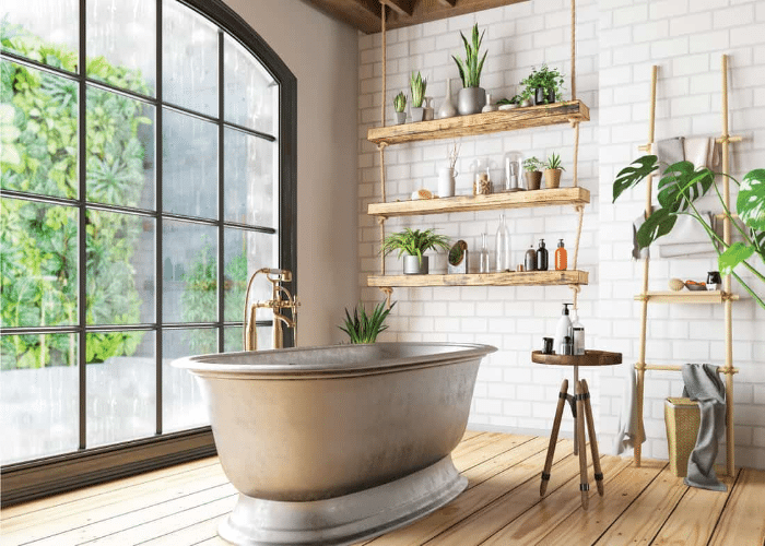 Alternatively, if one doesn’t want to go for traditional bathroom shelves, one can consider introducing ladder shelves, tables, and other accessories to shelve plants.