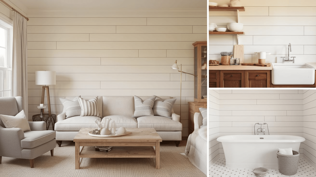 - Horizontal Shiplap – The most common style. Makes rooms look wider and gives a classic farmhouse feel.