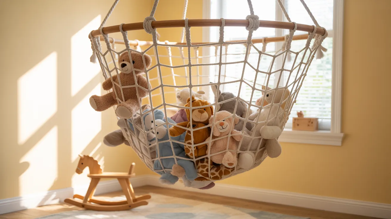 If you’ve got some wall space, hanging nets and toy hammocks are a quick way to lift the mess off the floor. I like using them in corners or above the bed to make the most of unused space.