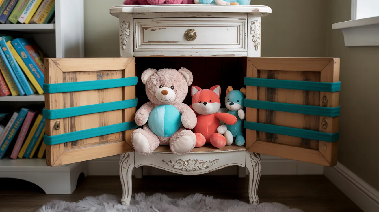 This design is easy to build, requiring only a few vertical posts and some elastic or bungee cords. It works well in bedrooms where toys tend to accumulate near the corners anyway. It’s a smart way to organize without giving up floor space.