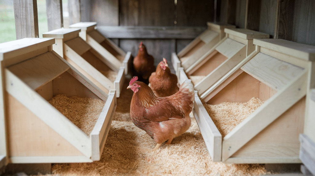 Line the boxes with soft bedding and position them lower than the roosting bars to prevent chickens from sleeping in them, keeping the eggs clean and the boxes dry.