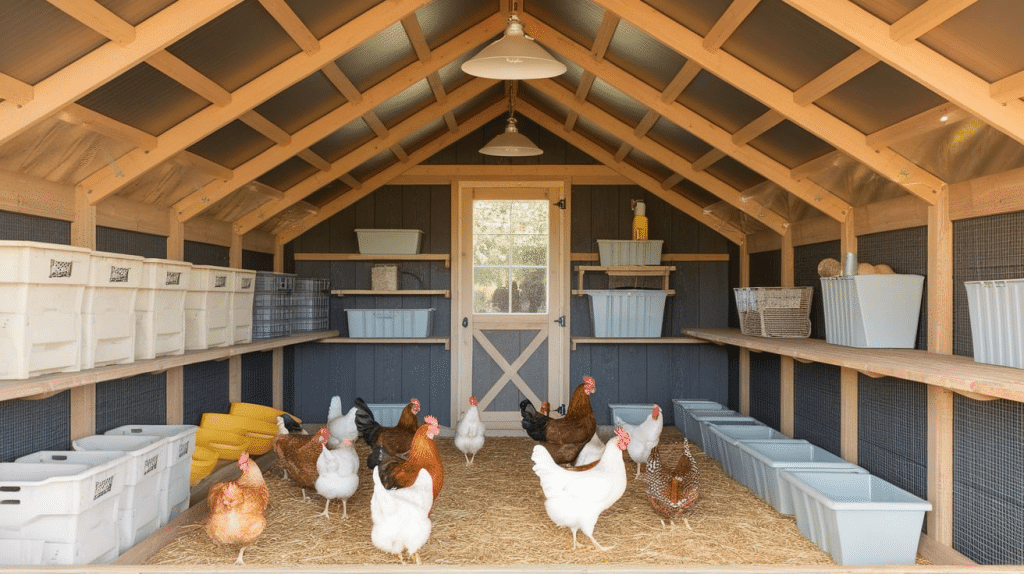 A well-planned interior gives your chickens a safe and comfortable space while keeping your supplies organized. Here’s what to consider when designing your setup.