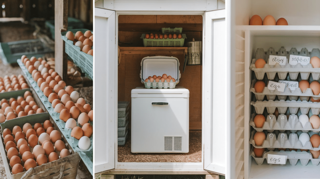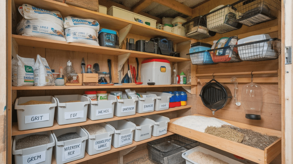 - Labeled storage bins keep small items like egg cartons, grit, and supplements organized.