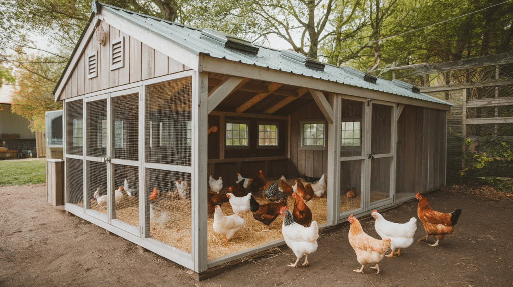 With good ventilation, proper roosting and nesting areas, and organized storage, you’ll have a setup that works for both you and your chickens!
