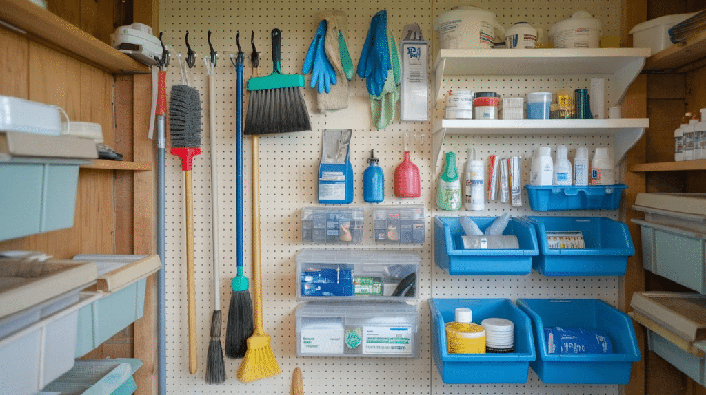 Simple shelves, hooks, and labeled bins can make a big difference in keeping your supplies in order.