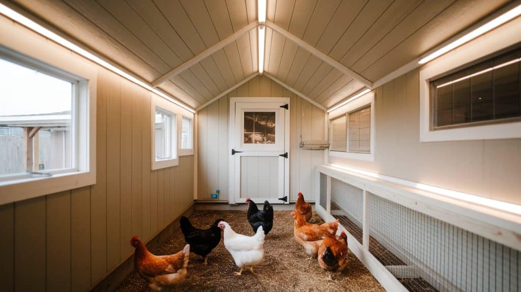 Chickens need light to stay active and lay eggs, so natural light from windows is ideal. In winter, you might need soft LED lighting on a timer to keep their routine steady and egg production consistent.