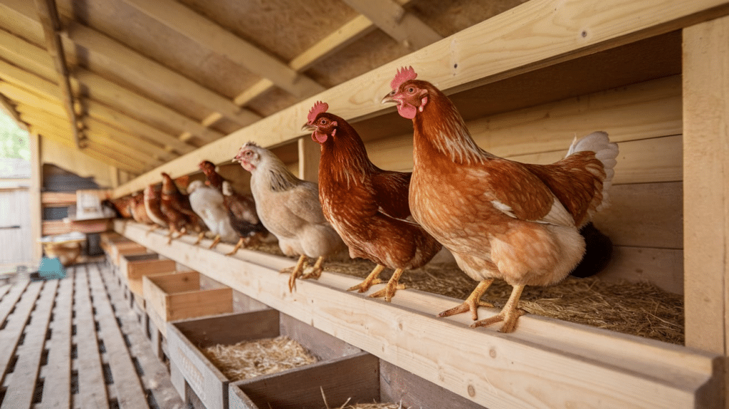 - Roosting Bars: Keep them higher than the nesting boxes, away from food and water.