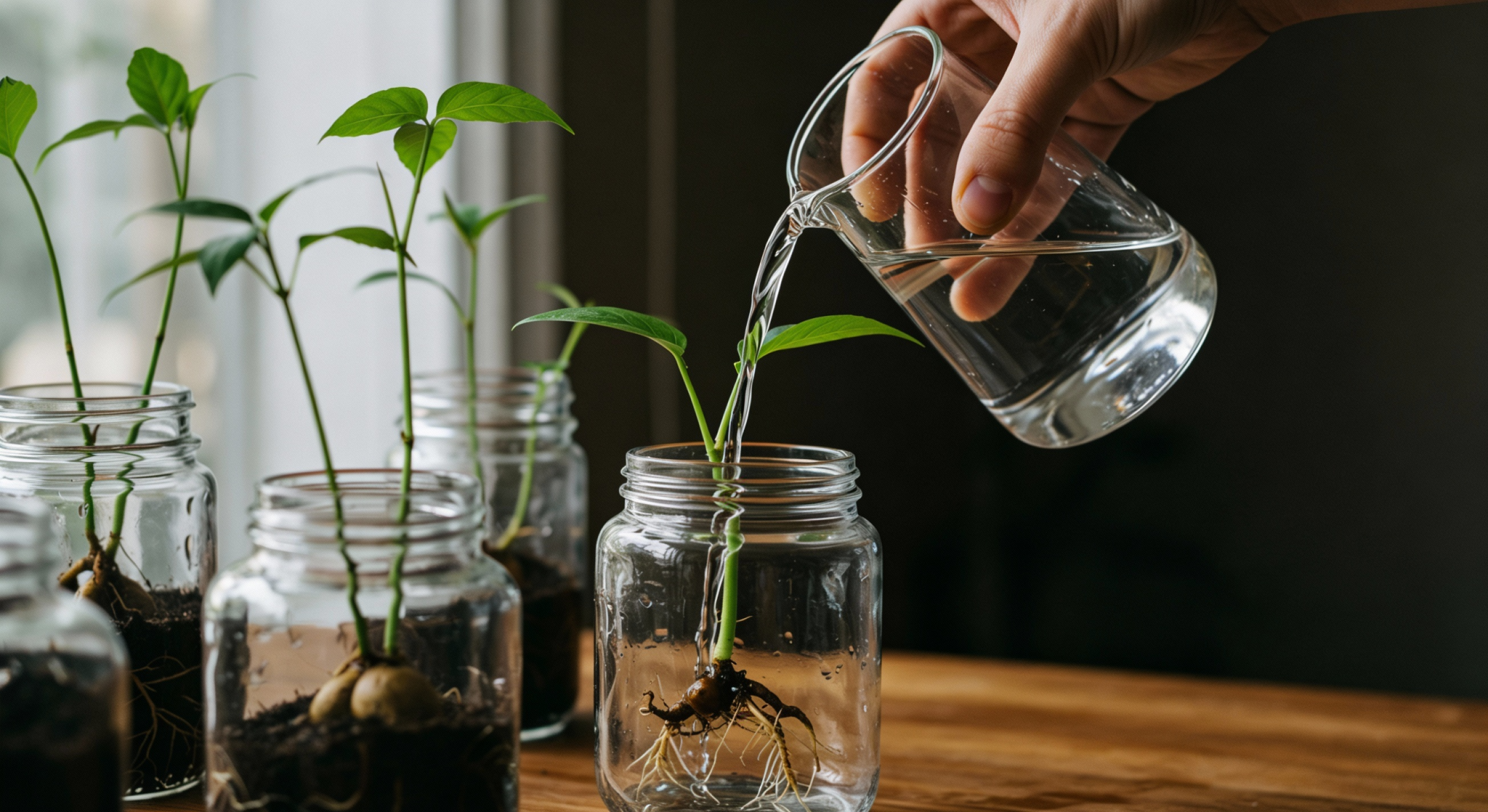 Fill a clear glass or jar with room-temperature water. Place your cuttings so that the nodes are underwater, but the leaves stay above. Don’t crowd too many cuttings in one container.