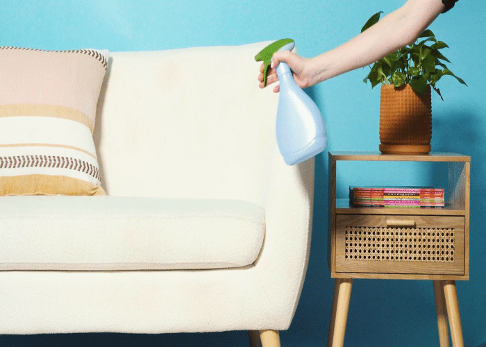 Stain-resistant fabric sprays are very effective when it comes to protecting a couch. These sprays create an invisible barrier due to which the liquid does not get absorbed into the couch. However, do perform a patch test in one of the corners of your beige couch to check for any discoloration.