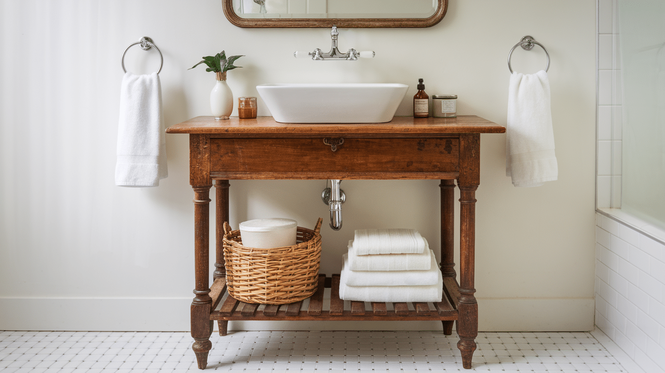 An antique wash stand can work well as a bathroom vanity. The top is a good spot for a small sink. You can cut a hole for plumbing and use the drawers to store towels, soap, and other bathroom items.