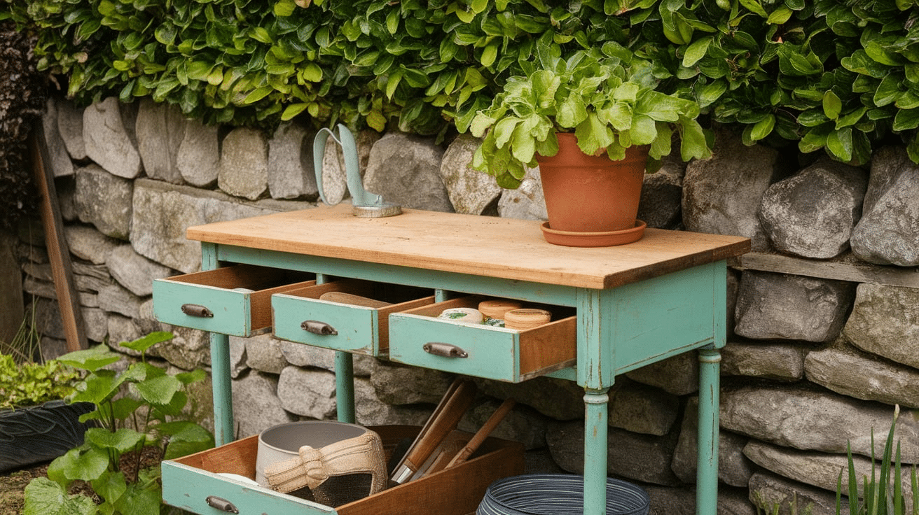 An old wash stand can be a useful garden potting station. The top gives you space to repot plants, sort seeds, or trim flowers. The drawers or cabinet can store gardening tools, extra pots, and plant food.