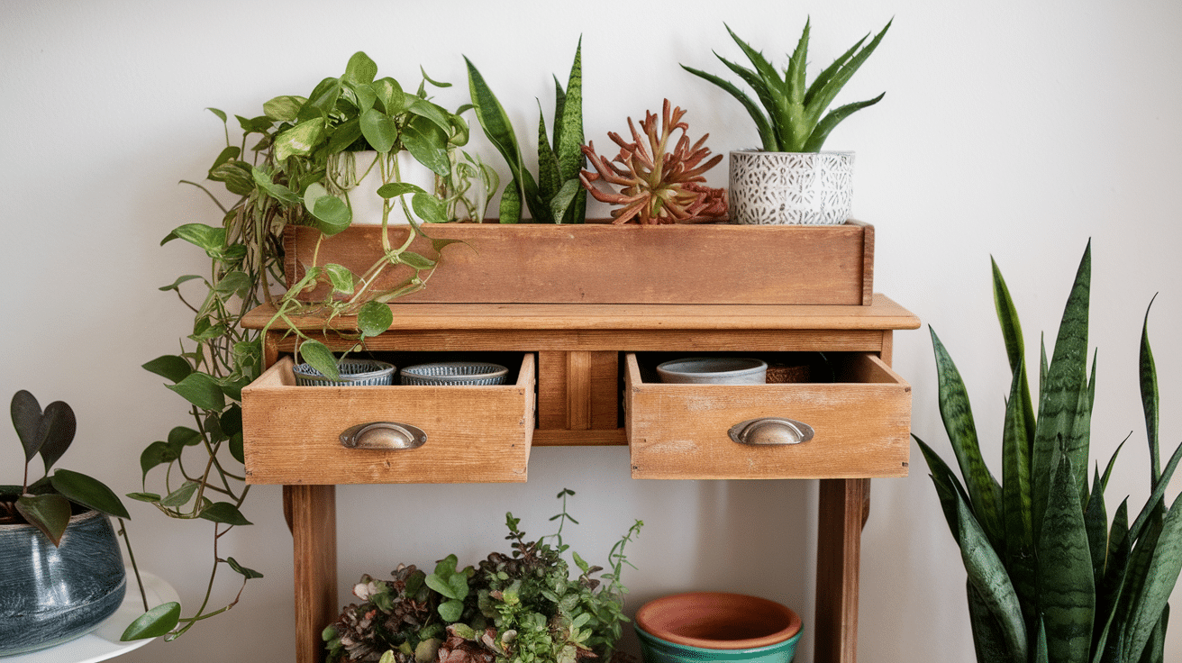 This is a simple way to use an old wash stand instead of buying a potting table. It keeps your gardening supplies in one place and makes plant care easier.