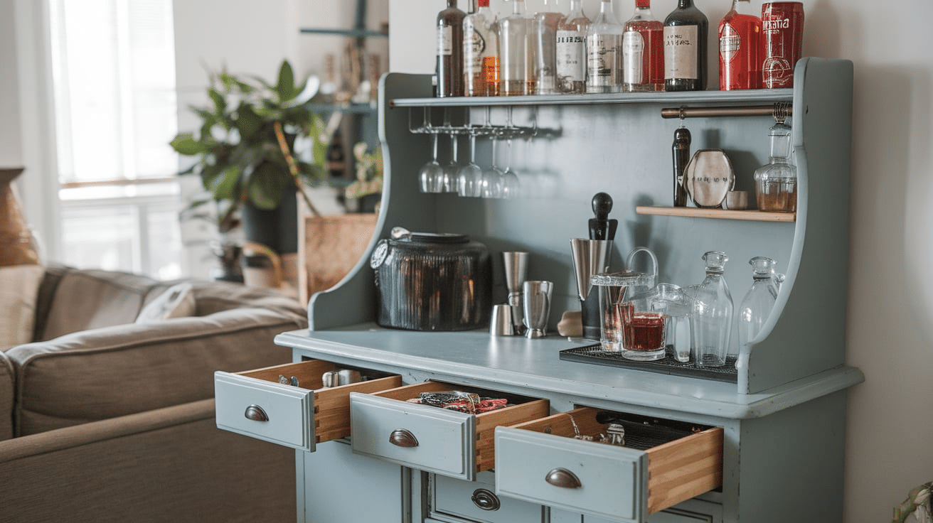 If you are turning it into a mini bar, install racks for wine glasses or hooks for hanging bar tools. The drawers can hold napkins, bottle openers, and other small items.