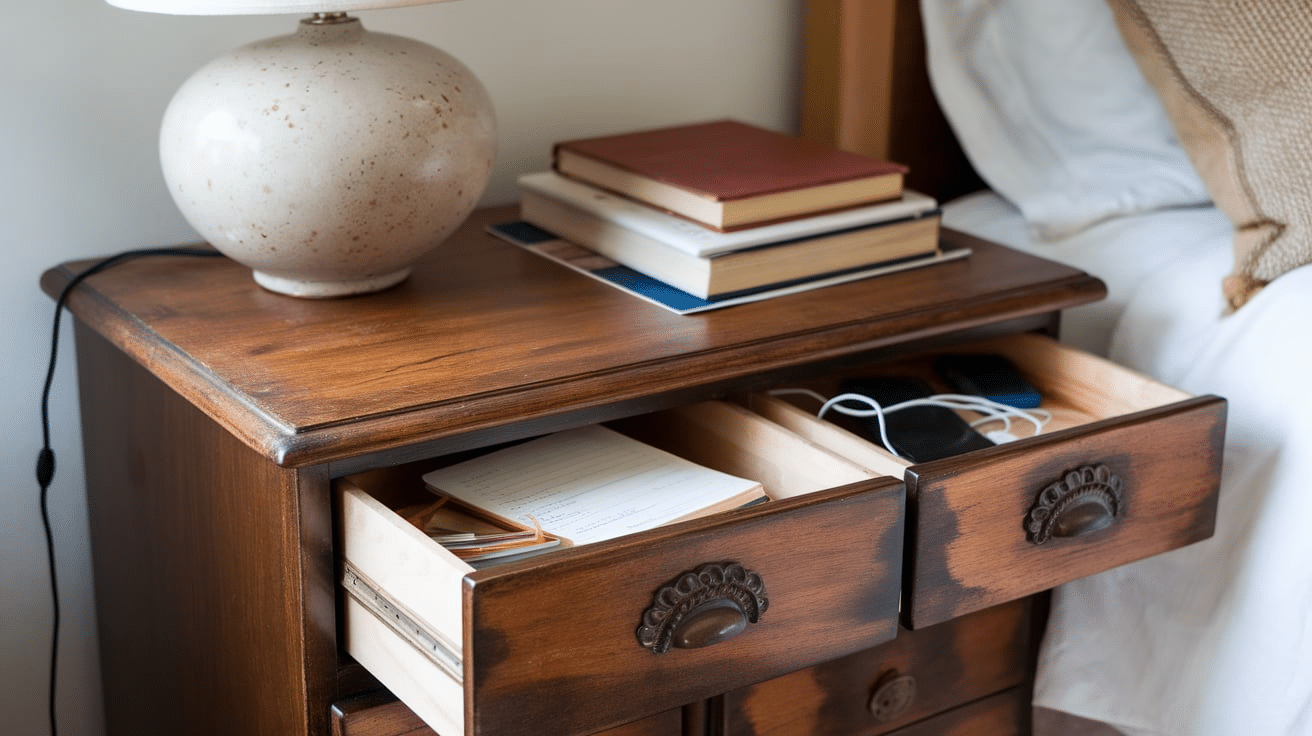 An antique wash stand can be used as a nightstand in your bedroom. The top is a good spot for a lamp, books, or a clock. The drawers or cabinet can hold small items like chargers, notebooks, or bedtime essentials.