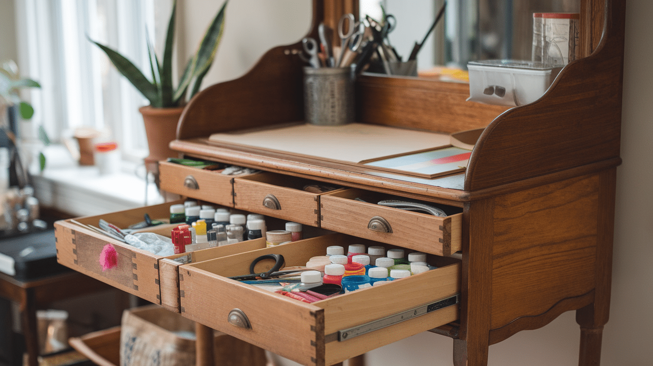 You can paint or stain the wash stand to match your craft area. If you need more storage, adding small baskets or hooks on the sides can help keep things organized. Labeling the drawers can also make it easier to find what you need.
