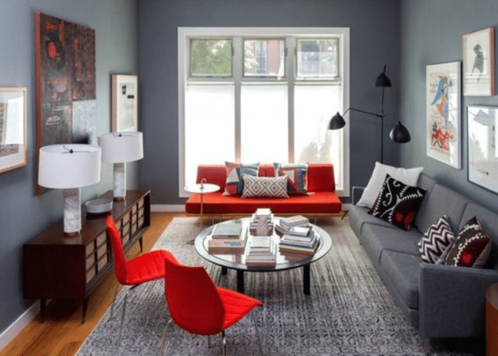 For example, a red rug, a black vase on the table in the center, yellow cushions, orange flowers, etc., automatically help enhance the look of the place.