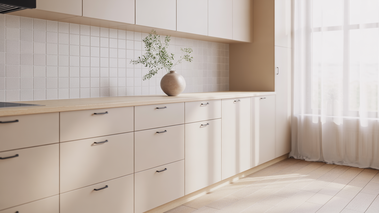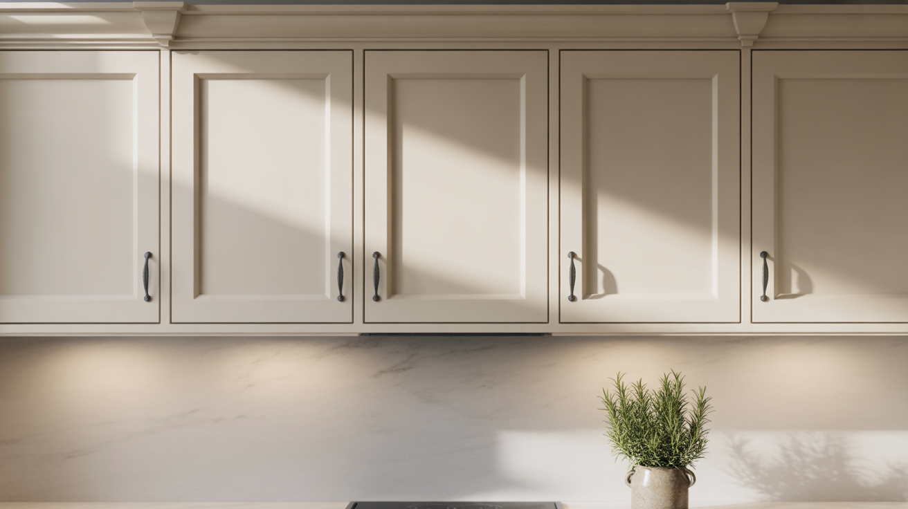 Softened cabinet tones create warmer environments than stark white. Black elements remain crisp against these subtle backgrounds while the gentler palette feels more welcoming and lived-in.