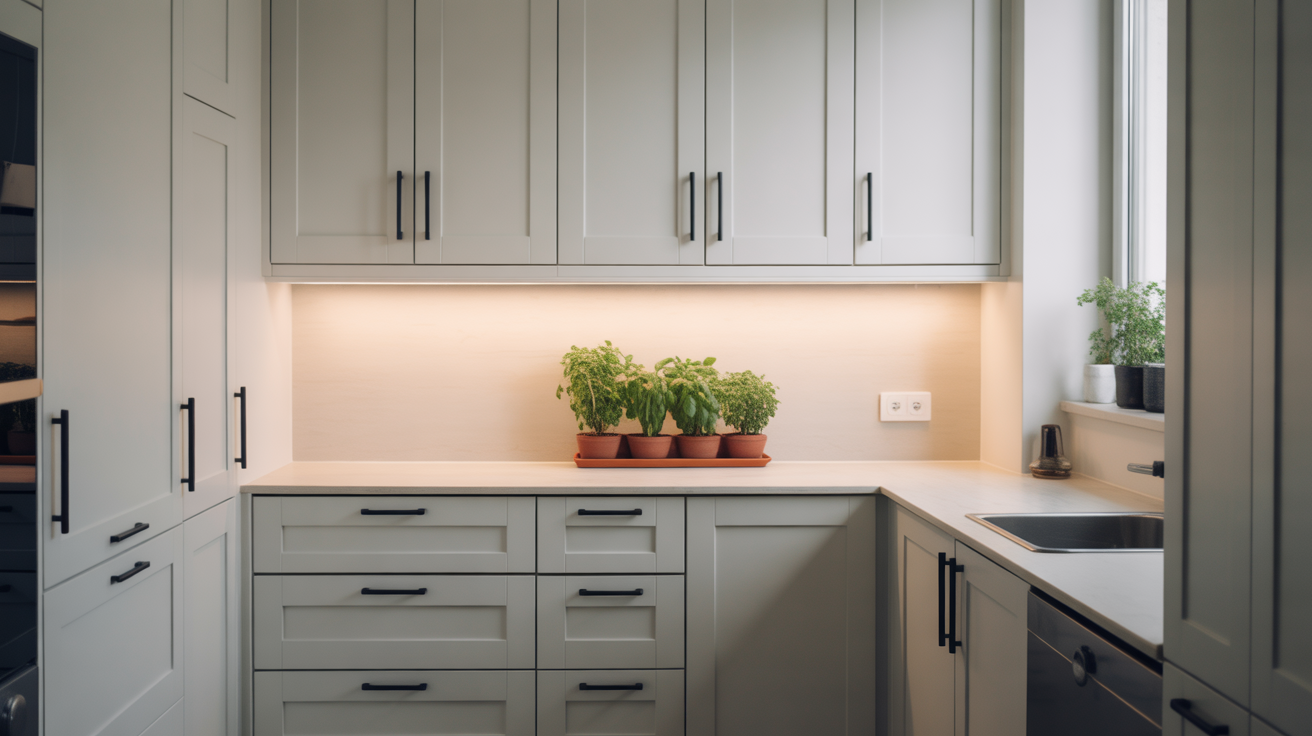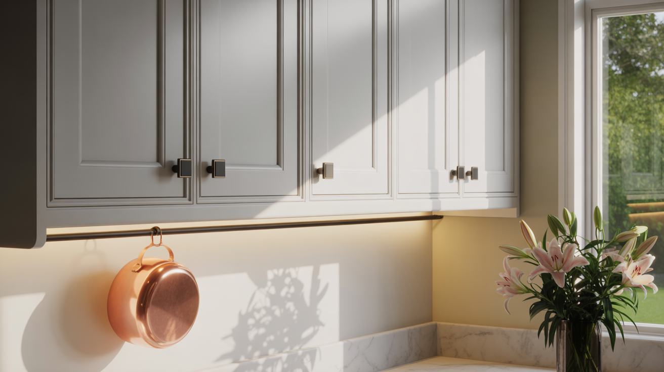Use one hardware style throughout to maintain visual consistency. This unified approach prevents the eye from stopping at different elements, creating a more expansive feel in compact kitchen layouts.