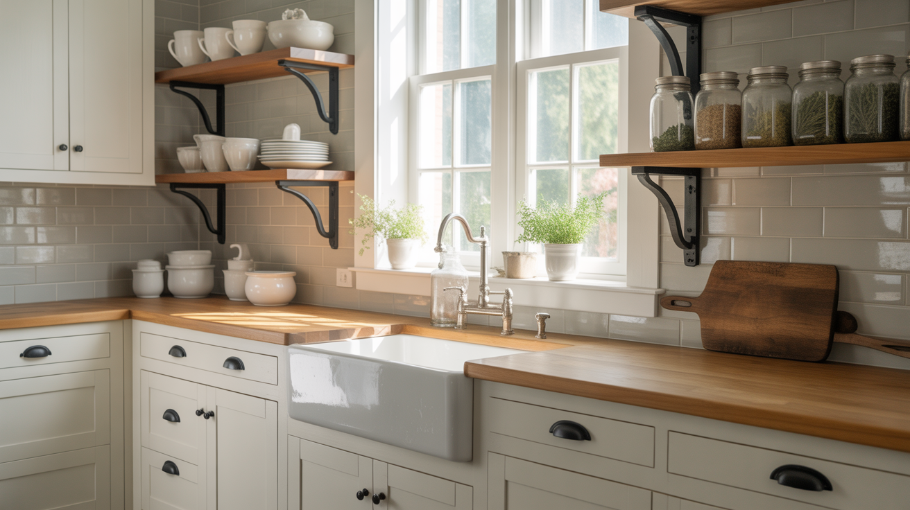 3. Farmhouse Kitchen with Black Cup Pulls and Exposed Shelves