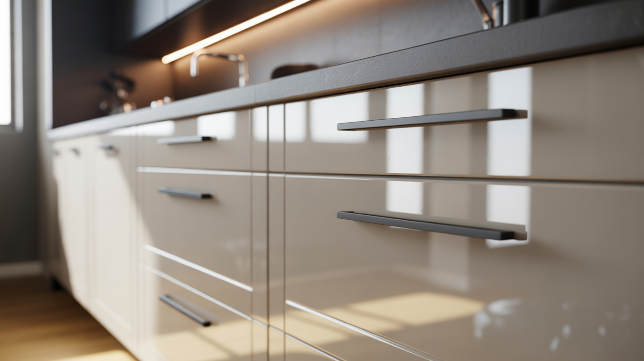 Reflective cabinet surfaces are enhanced by minimalist hardware, which adds contemporary elegance. The textural contrast between shiny cabinets and non-reflective black pulls adds subtle depth to the kitchen design.