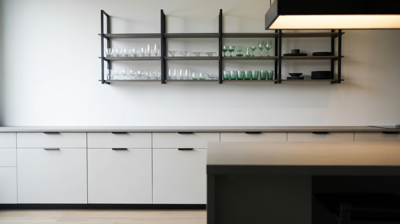 Balance expansive cabinetry with open shelving sections. Black brackets supporting white or wood shelves create structural rhythm while breaking up large expanses of solid cabinet fronts.