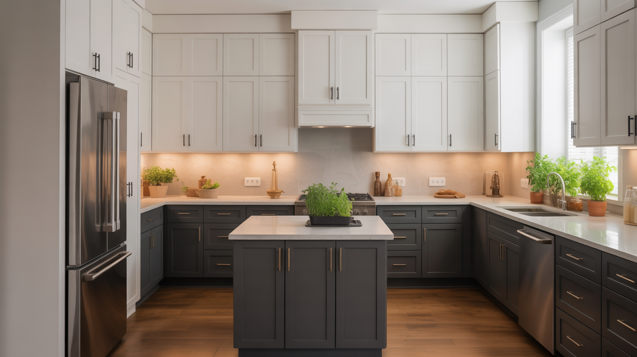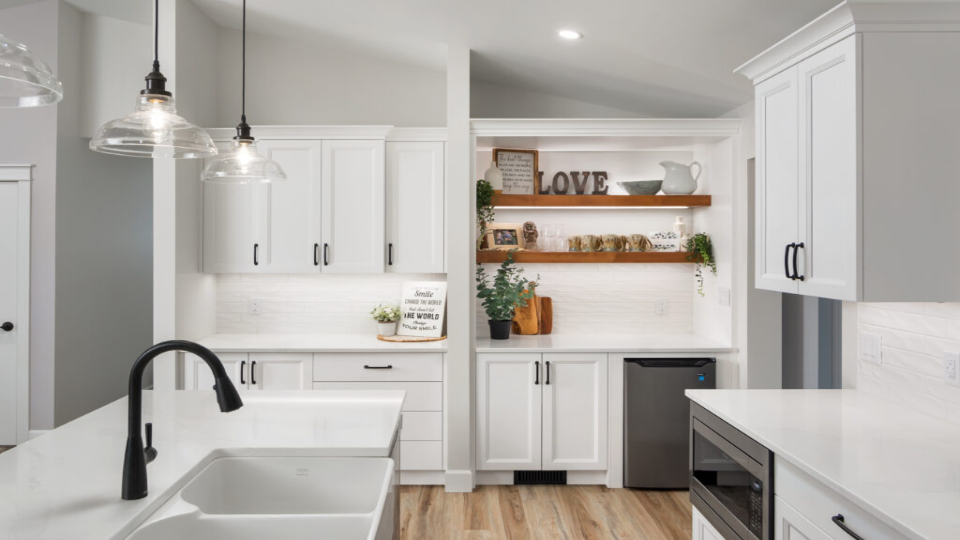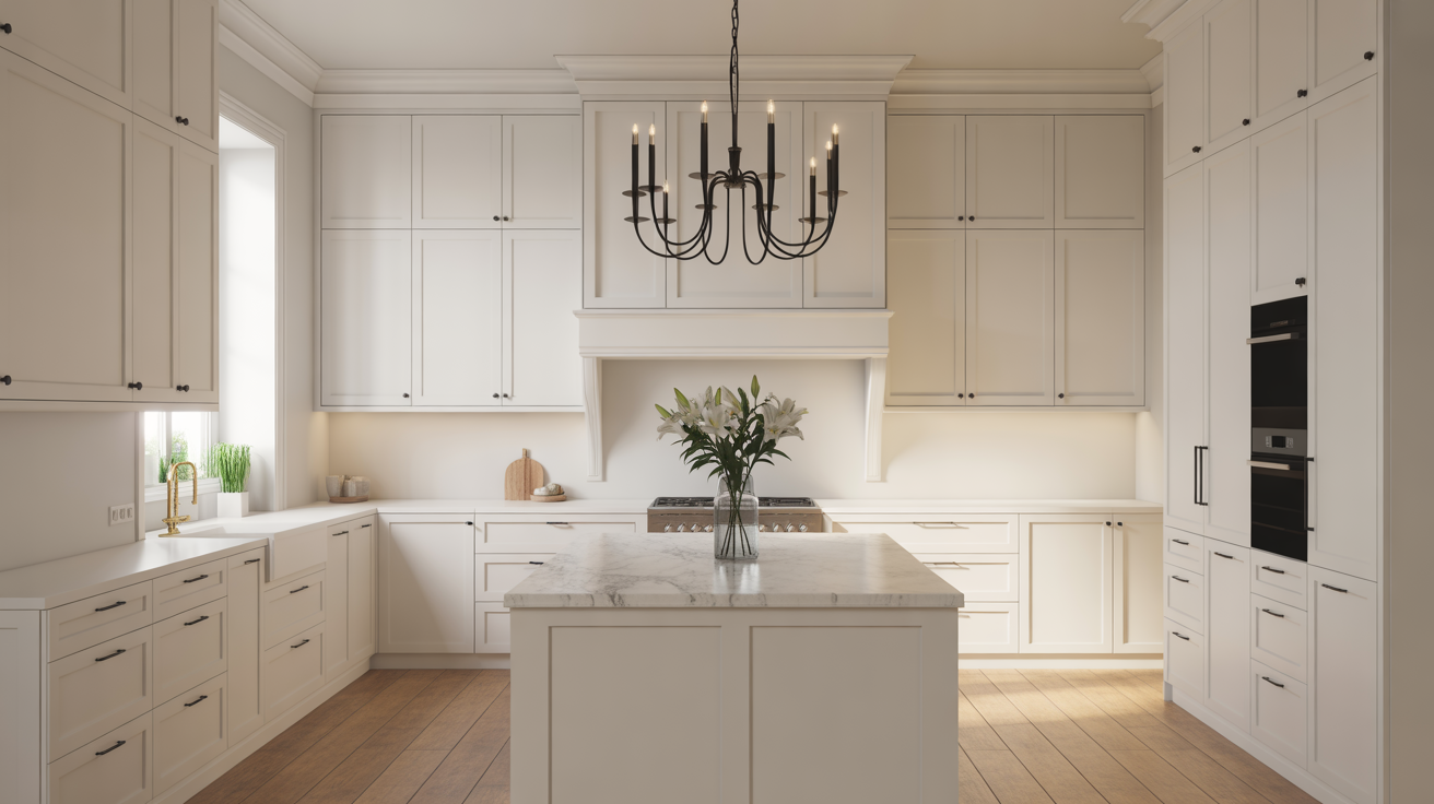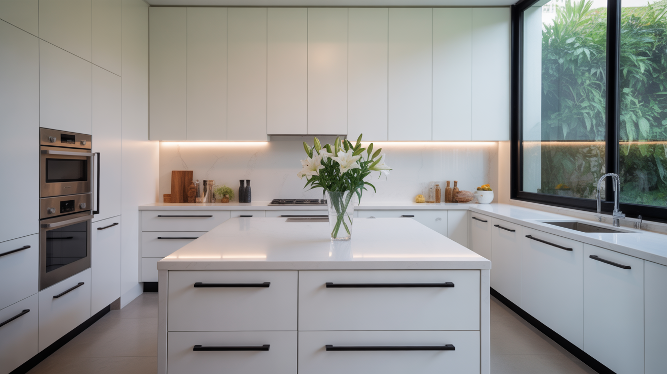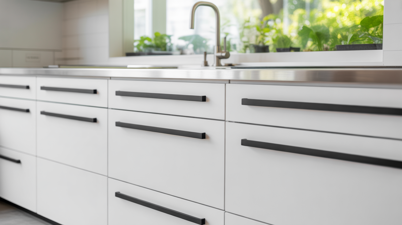 White cabinets and black hardware create a striking visual contrast. This pairing offers clean lines that add structure and elegance to any kitchen.